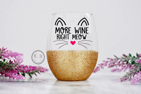 More Wine Right Meow wine glassf Again, this wine lover loves a fun wine glass that doubles as a social media meme! This handmade wine glass is made-to-order and ships worldwide.