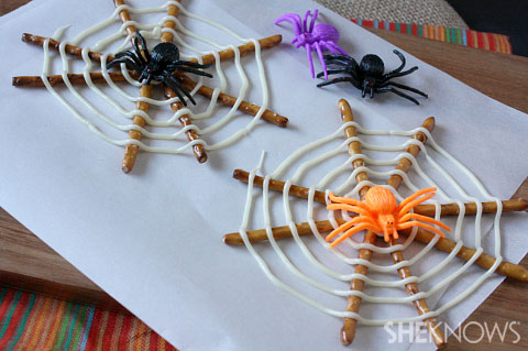 - Spider Webs- Lay out some waxed paper on the counter or table. Set up 8 pretzel sticks so they look like the spokes of a bicycle wheel. Continue setting up more “wheels” all over the waxed paper. In a microwave safe dish melt some chocolate melts according to package directions. White or dark chocolate will work for this treat. Transfer melted chocolate into a resealable plastic bag. Make a tiny snip on one corner of the bag. Start in the center of the pretzel sticks and cover all of the ends with chocolate so they are sure to stick together when the chocolate sets up. Then continue around in a spiral pattern making a spider’s web. You can add a few Halloween sprinkles to the chocolate after you make the webs if you’d like. If you are in a rush, you can slide the waxed paper sheets onto a cookie sheet that has been flipped over and chill these in the refrigerator.