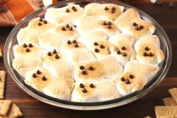 - Ghost S’mores- Gather up small cellophane bags, graham crackers, mini chocolate bars, marshmallow ghost peeps and ribbon. Place two squares of graham crackers on one side of the bag. On the other side of the bag place 2 mini chocolate bars. In front of the graham cracker squares place a ghost peep. (Just like Easter peeps, but these treats are white, shaped like a ghost and have a face) Finish the treat bag by tying it with a pretty ribbon.
