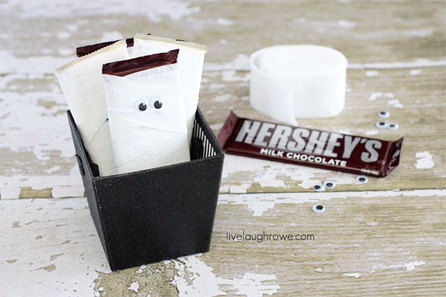 - I want my Mummy- You will need full-size chocolate bars, big googly eyes and white crepe paper streamers. Glue the googly eyes toward the top of the chocolate bar.Next, wrap the white streamer around the bar so that it looks like a mummy. End your strip on the back of the bar and tape down the end so that it doesn’t unravel.