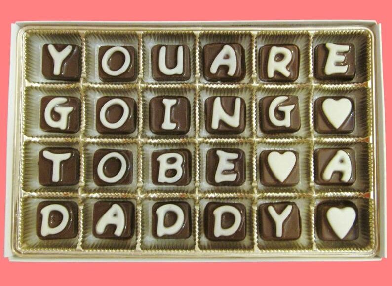 If your sweetie has a sweet tooth, surprise him with the news spelled out in chocoloates. Order a box of it here at by the seller on Etsy.