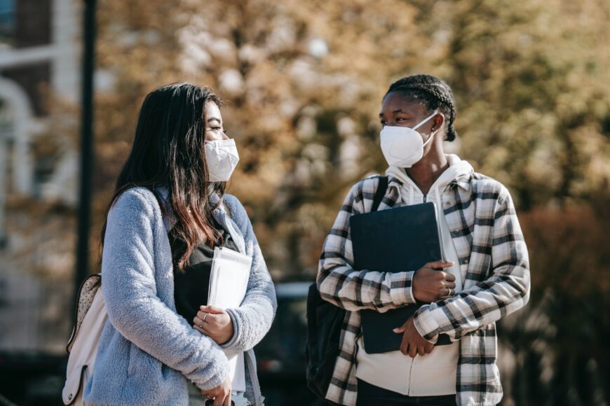 two college girls walking outside a college building